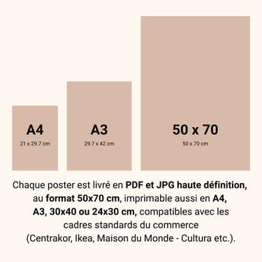 Chaque poster est livré en PDF et JPG haute définition, pour un format 50x70 cm imprimable aussi en A4, A3, 30x40 ou 24x30 cm, compatibles avec les cadres standards du commerce.